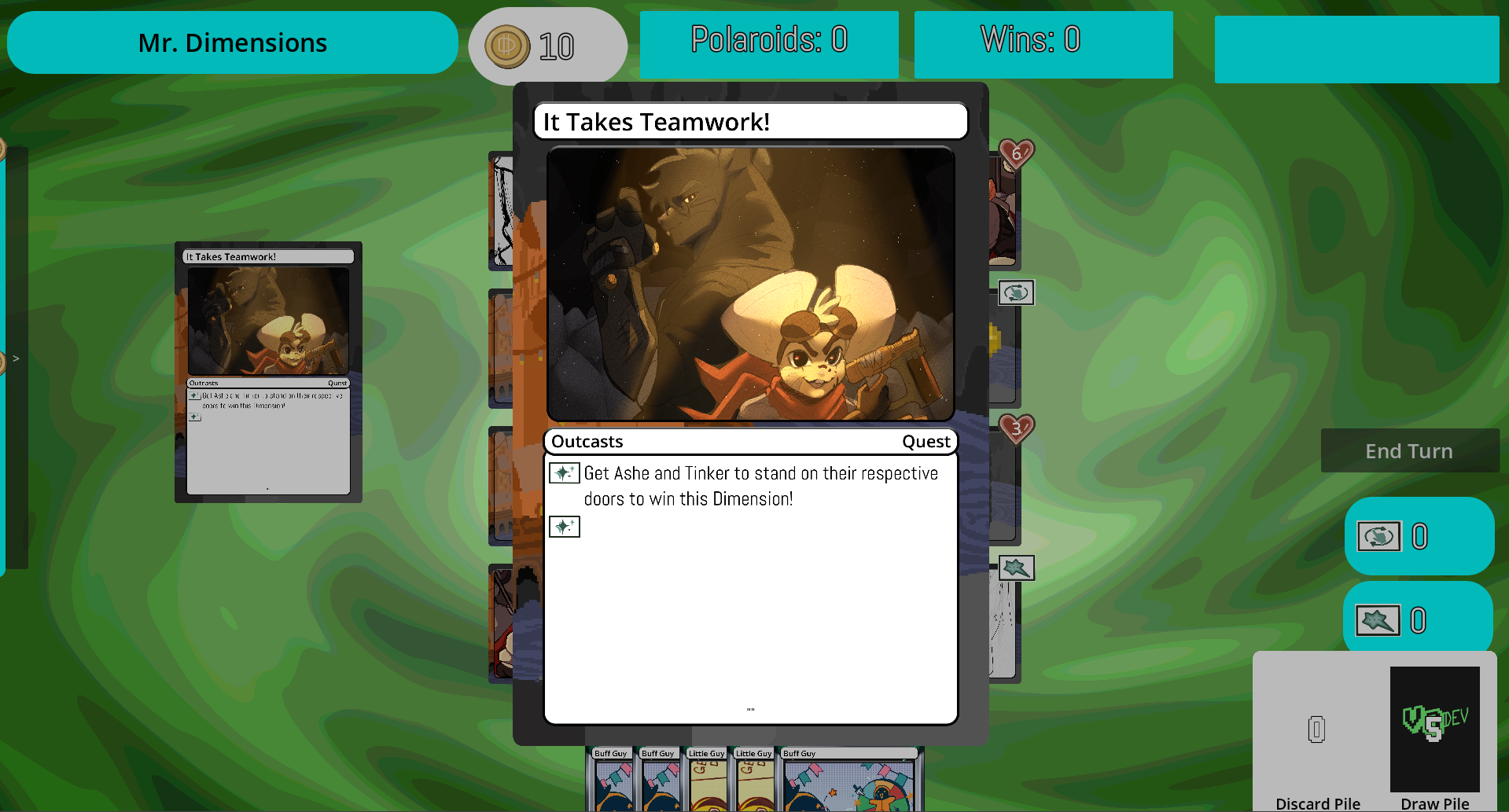 VGDimensions is a competitive deckbuilder in which two players find themselves happily journeying between various VGDev game dimensions with Little Guy until... Oh no! Rifts have started opening up and all the games are crossing over with each other! Armed with only their wits and items pouring in from other worlds, each player is aiming to be the first to solve each game's troubles! The player who solves the most quests wins!