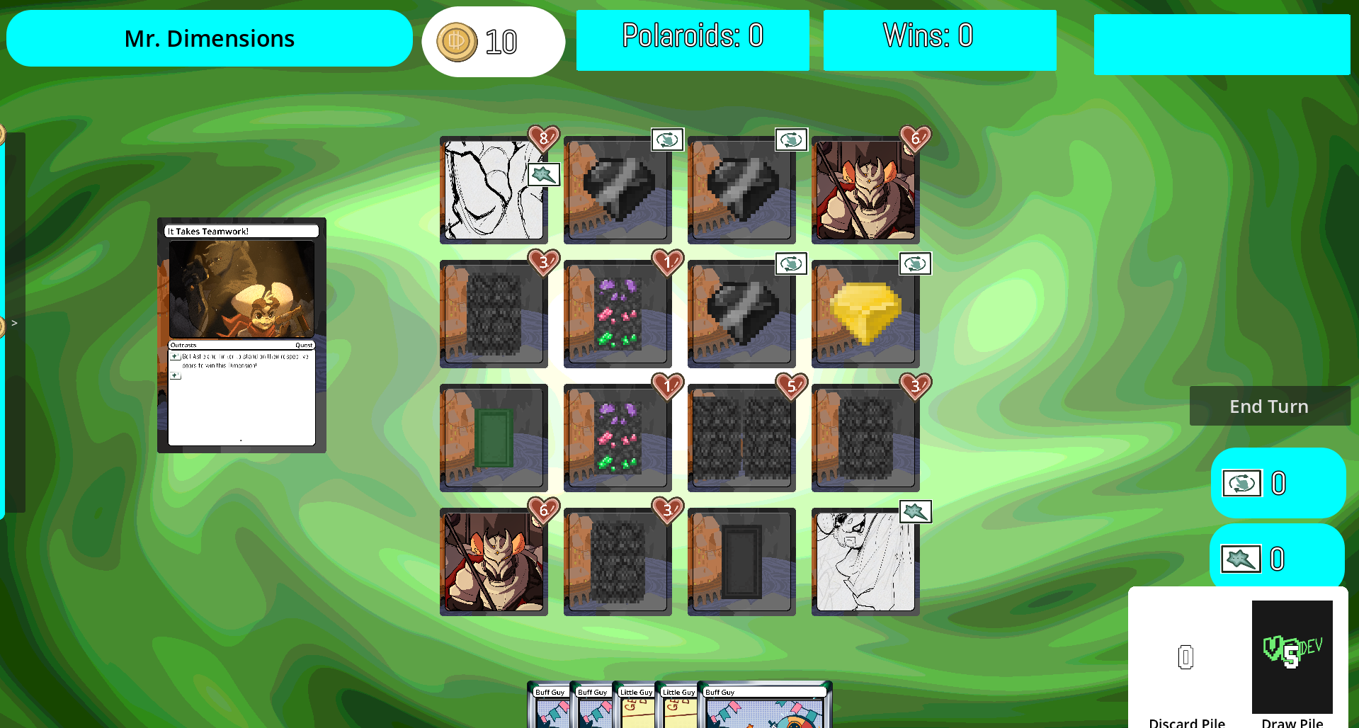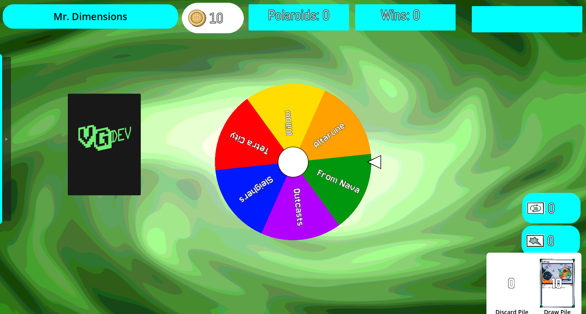 At the beginning of the game, the wheel will spin in order to select the next VGDev game dimension to play. This selected VGDev game determines the objective of the current round, as well as what cards can spawn on the board.