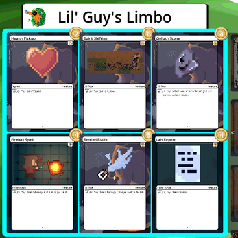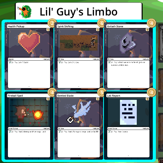 The current objective of the game can be checked by inspecting the leftmost card. More cards can be bought and added to your deck by hovering over the shop (Lil Guy's Limbo) and left clicking the desired card, as long as the player has enough currency (DeLeons).